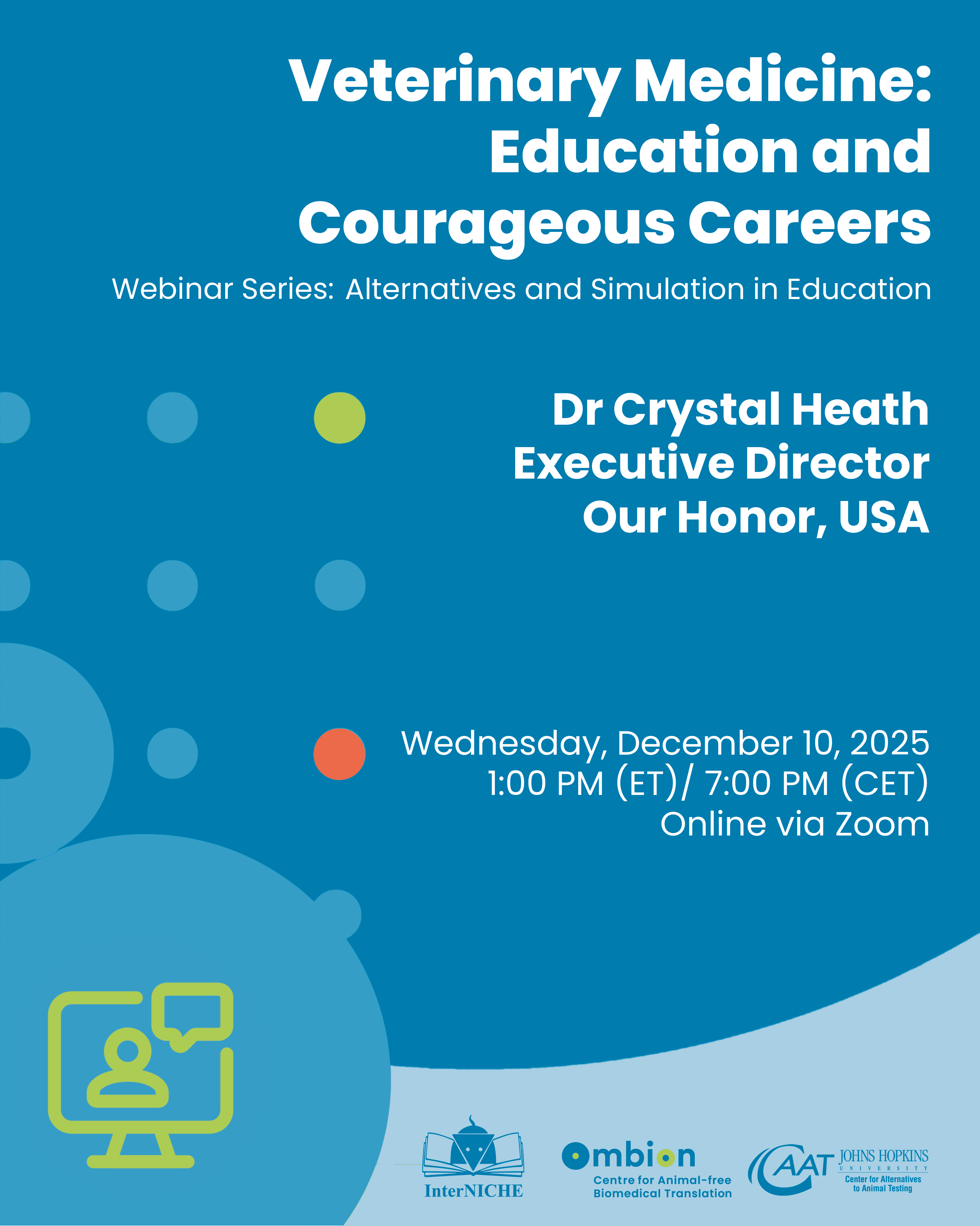 Veterinary education and the veterinary profession both exist within a social and economic context that does not always serve the animals’ interests, nor those of veterinary students and practitioners. Despite some progressive changes, practices such as terminal laboratories and other harmful animal use continue in the practical classes of some departments at veterinary schools, and opportunities for clinical learning opportunities with animal patients are often under-utilized. The veterinary profession itself is influenced by corporate interests, in particular from intensive animal-based protein production, which compromise the nature and practice of veterinary medicine, including in education. In this webinar, the Executive Director of US non-profit Our Honor, Dr Crystal Heath, will discuss education and careers in conversation with InterNICHE Co-ordinator Nick Jukes. Dr Heath will describe a new study into the use of terminal laboratories at North American vet schools, and address the opportunities and advantages of patient-based spay-neuter work and shelter medicine for hands-on skills acquisition. She will identify the interests that have directed the focus of veterinary medicine away from the welfare and rights of animals and veterinarians, and show how the latter can use their position and skills to challenge this and to reconnect the profession with its oath. Acknowledging the growing potential of careers in effective research for the veterinary graduate, she will describe other career options that involve working a practitioner and a campaigner. In particular, she will explore the ‘courageous choices’ that might be faced and that can be taken by veterinarians in the service of animals and the profession - with benefit to society and beyond.